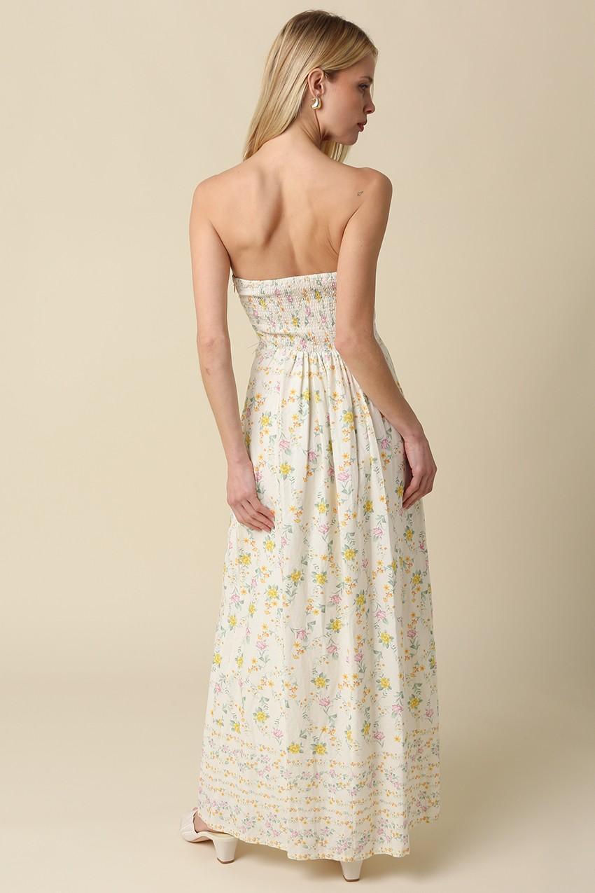 Our Nicole Strapless Floral Maxi Dress features a strapless neckline with a fitted bodice and side zipper closure for a clean, elegant silhouette and a flowy maxi length skirt with a soft floral print and a lightweight linen blend fabric for a romantic and breathable feel.